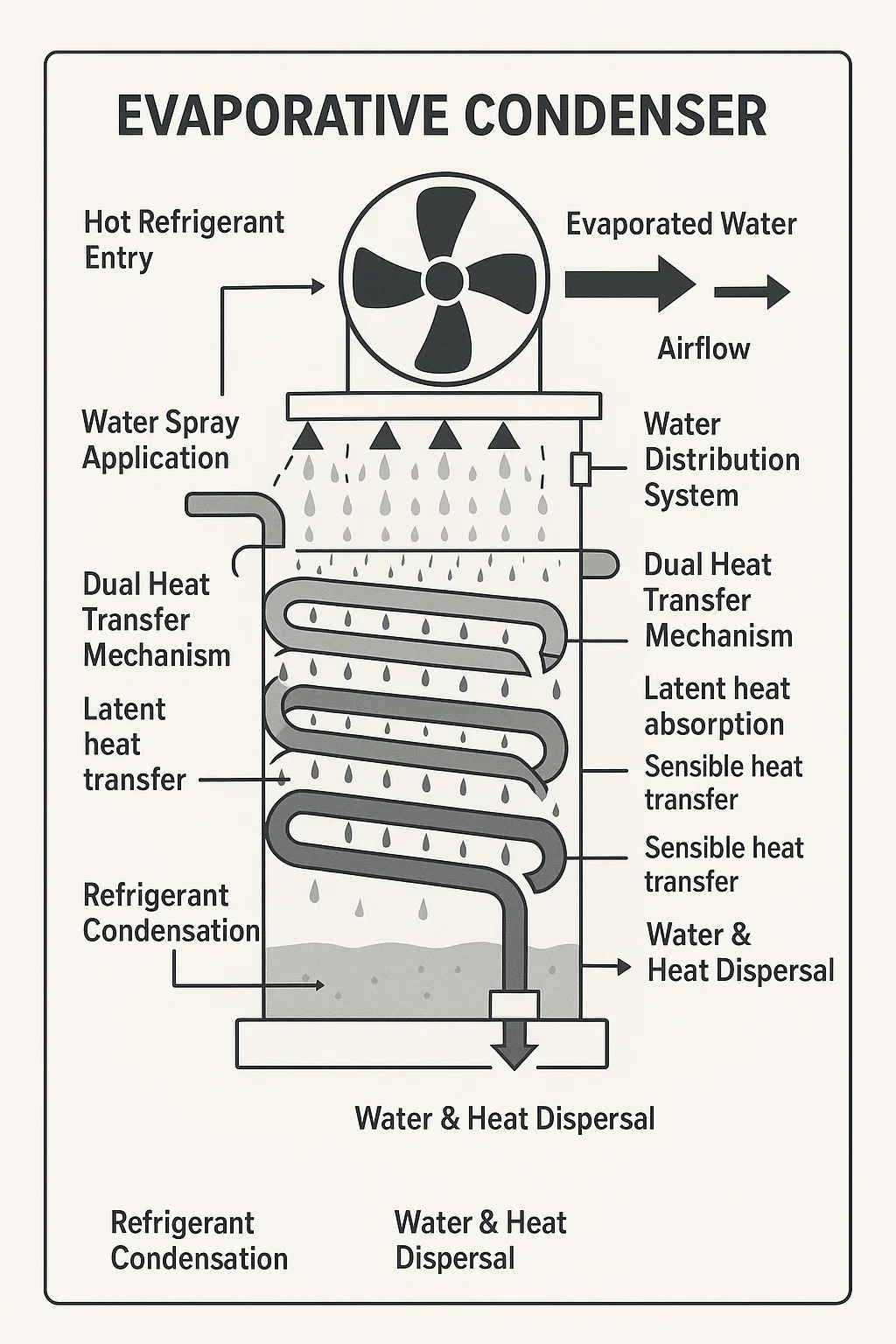 คอนเดนเซอร์แบบระเหยจะปฏิเสธความร้อนโดยการผสมผสานการระบายความร้อนด้วยอากาศกับการระเหยของน้ำ ต่างจากคอนเดนเซอร์มาตรฐานที่ใช้การถ่ายเทความร้อนสัมผัสเพียงอย่างเดียว โดยใช้ประโยชน์จากการดูดซับความร้อนแฝงในระหว่างการระเหยของน้ำ