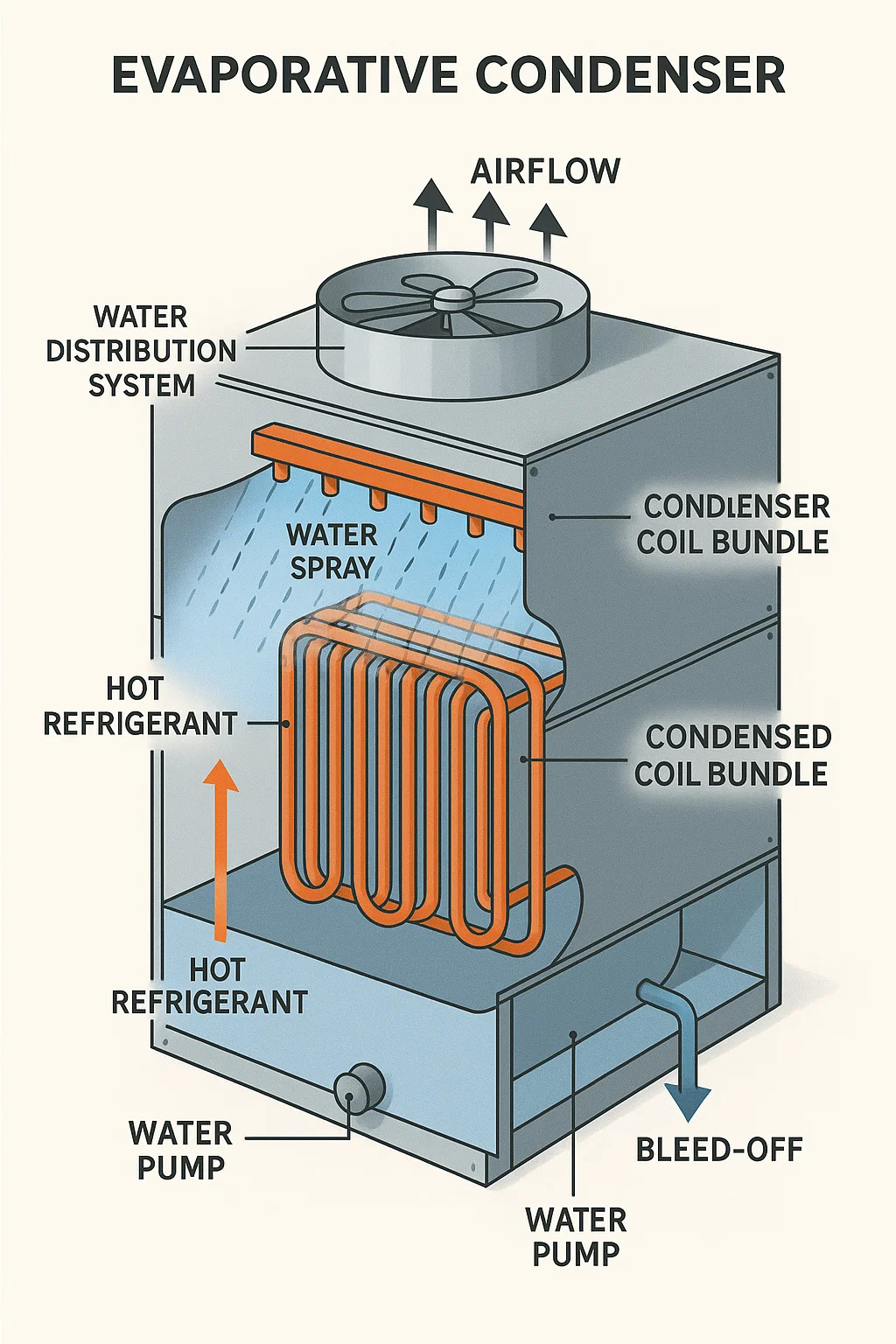 หนึ่ง คอนเดนเซอร์แบบระเหย ผสมผสานการระบายความร้อนด้วยอากาศและการระเหยของน้ำเพื่อปฏิเสธความร้อนจากระบบทำความเย็น การออกแบบและการทำงานแตกต่างโดยพื้นฐานจากคอนเดนเซอร์ระบายความร้อนด้วยอากาศมาตรฐาน:
